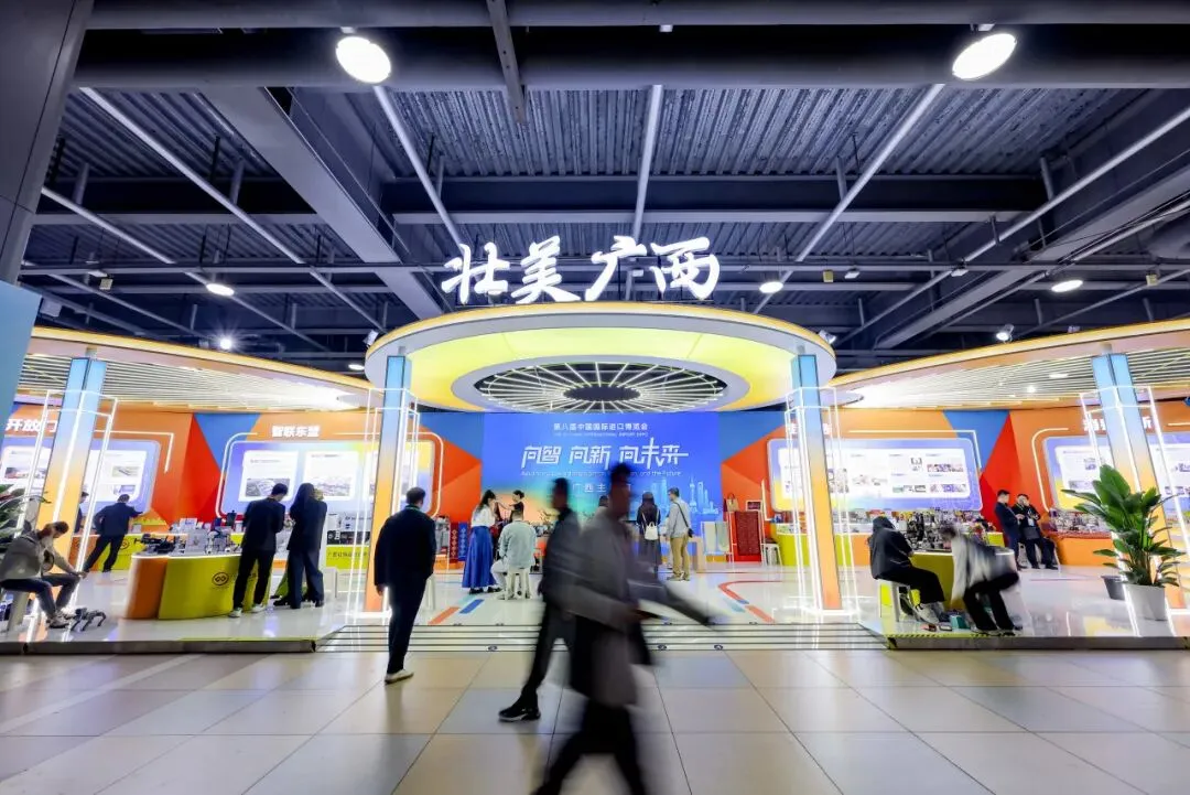 本届进博会,广西综合形象馆以“壮美广西·向‘智’向‘新’向未来”为主题,设置“开放门户、智联东盟、桂品臻选、消费焕新”四大主题板块,并配套“优品荟、美食荟”两大互动体验区,向全球客商“秀”出广西在推动“北上广研发+广西集成+东盟应用”和实现“东盟出产—广西集散—中国畅销”等方面的创新实践。