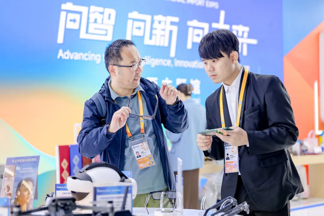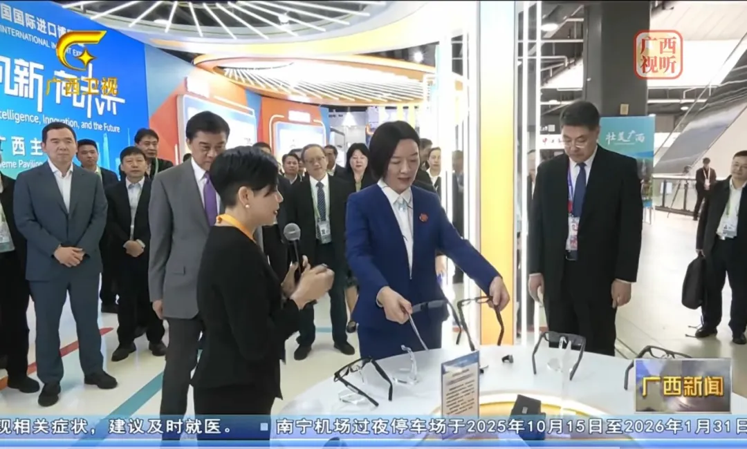 11月5日,第八届中国国际进口博览会在上海开幕。自治区商务厅携48家企业和超百款“广西好物”参展,自治区党委常委、自治区副主席卢新宁巡视广西综合形象馆,会见参展嘉宾及企业代表。迈越科技作为从广西本土成长起来的国家高新技术企业,携AI眼镜系列产品惊艳亮相,一展人工智能领域的广西风采。