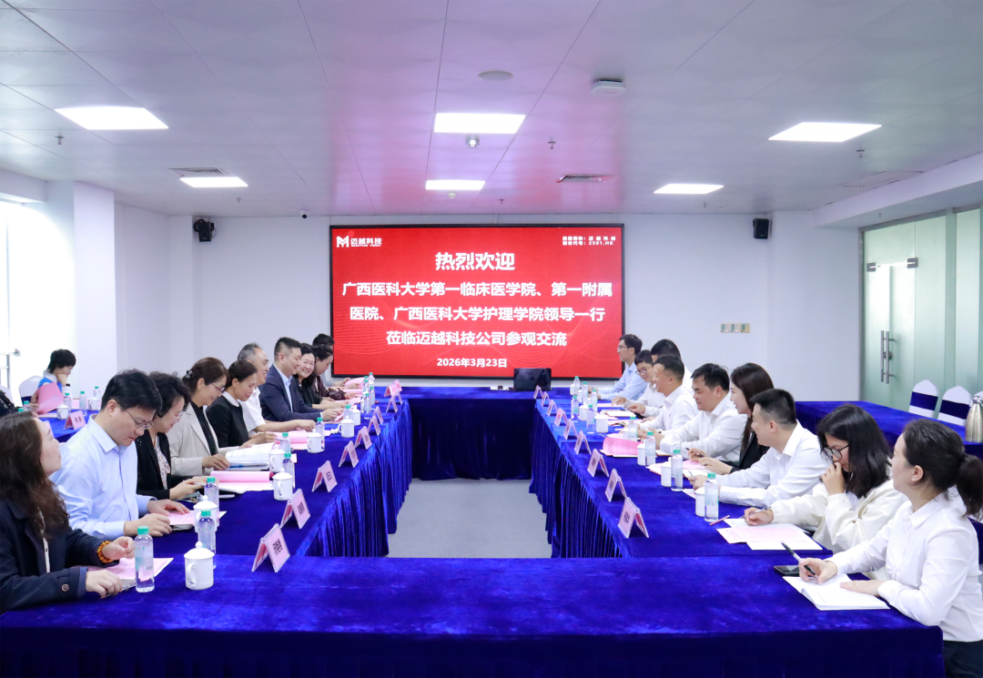 3月23日,广西医科大学护理学院党委书记苏上贵、院长程继文(兼第一附属医院副院长);第一临床医学院、第一附属医院党委副书记莫新少携团队骨干到迈越科技股份有限公司(以下简称“迈越科技”)考察调研。迈越科技董事长李常青,党支部书记、执行董事张光柏,总经理李林甫带领团队热情接待,双方围绕医疗技术转化与产业融合深入探讨。