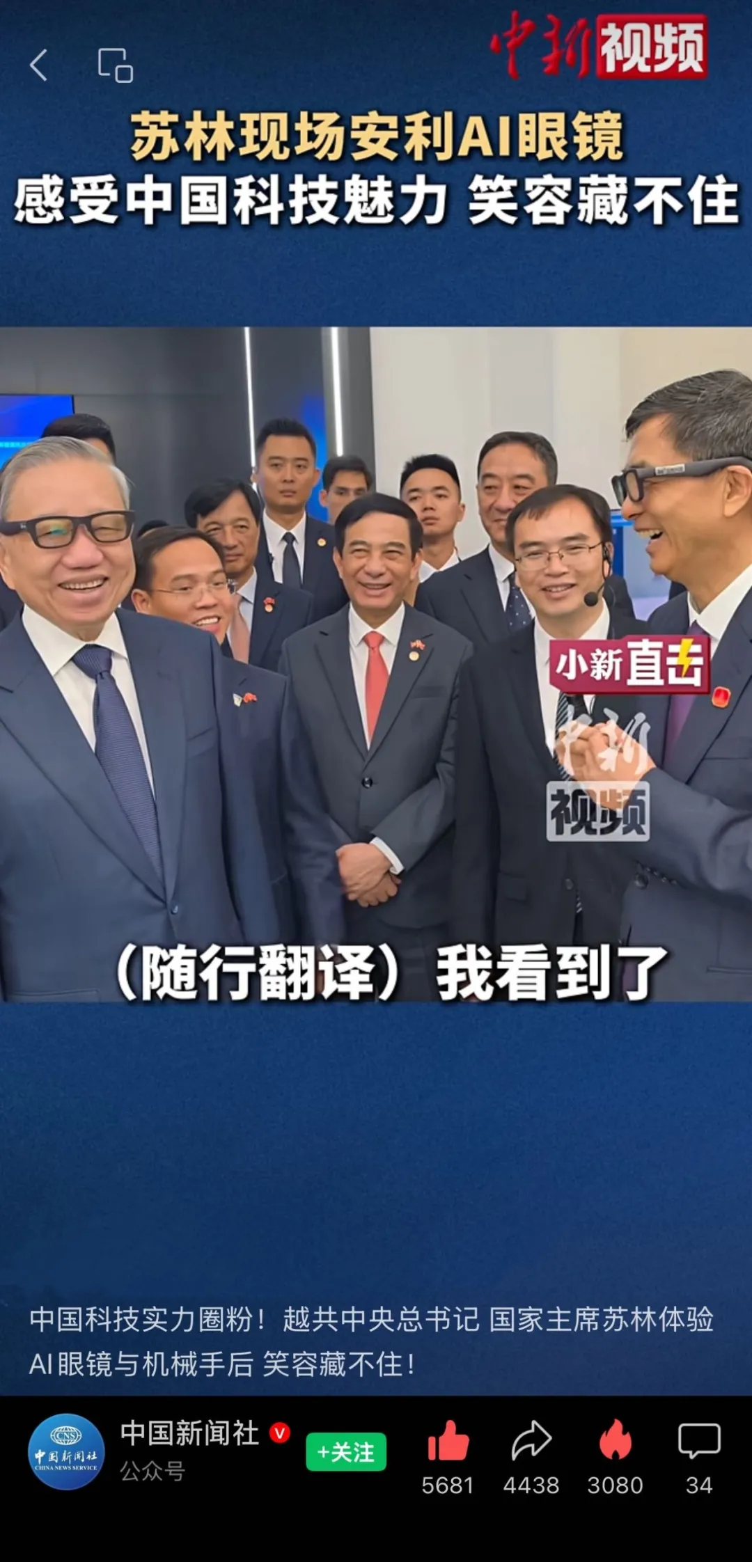 4月17日上午,正在中国进行国事访问的越共中央总书记、国家主席苏林来到广西南宁,参观中国—东盟国家人工智能应用合作中心,并现场体验迈越AI翻译提词眼镜,感受人工智能赋能交流的新场景。