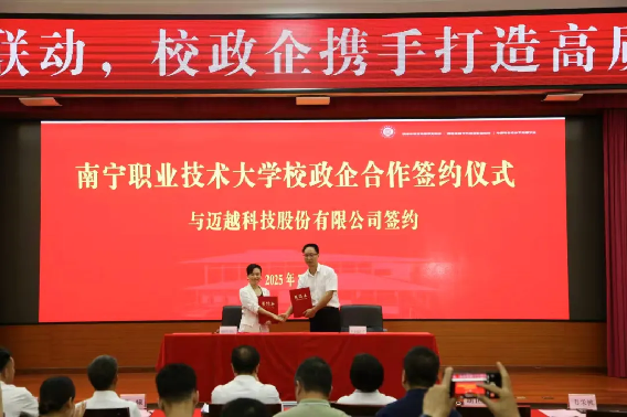 2025-07-20迈越科技与南宁职业技术大学签署战略合作协议 共筑产教融合新高地7月18日,南宁职业技术大学隆重举行校政企深化产教融合战略合作签约仪式,与北流市、横州市、宾阳县等3个县(市)人民政府,隆安县人力资源和社会保障局、教育局2个部门,以及迈越科技股份有限公司等7家企业签署深化产教融合战略合作协议。北流市人民政府副市长肖琴,横州市人民政府副市长黄曦,宾阳县人民政府常务副县长谢欢,南宁产投集团党委委员、副总经理韦采桃,隆安县人力资源和社会保障局党组书记、局长、县委组织部副...